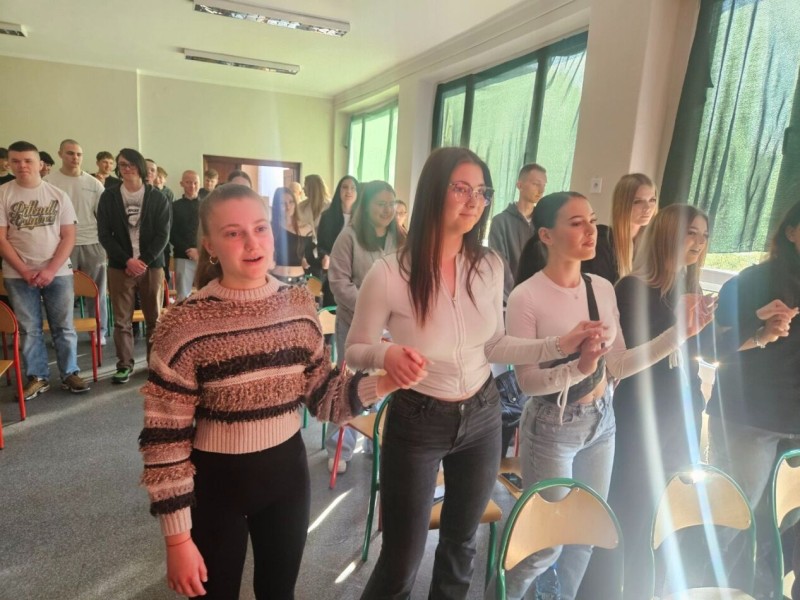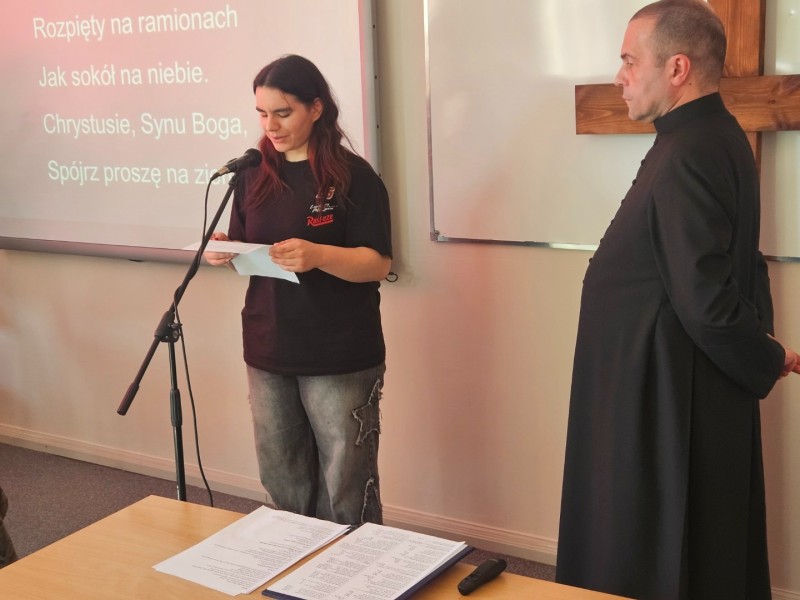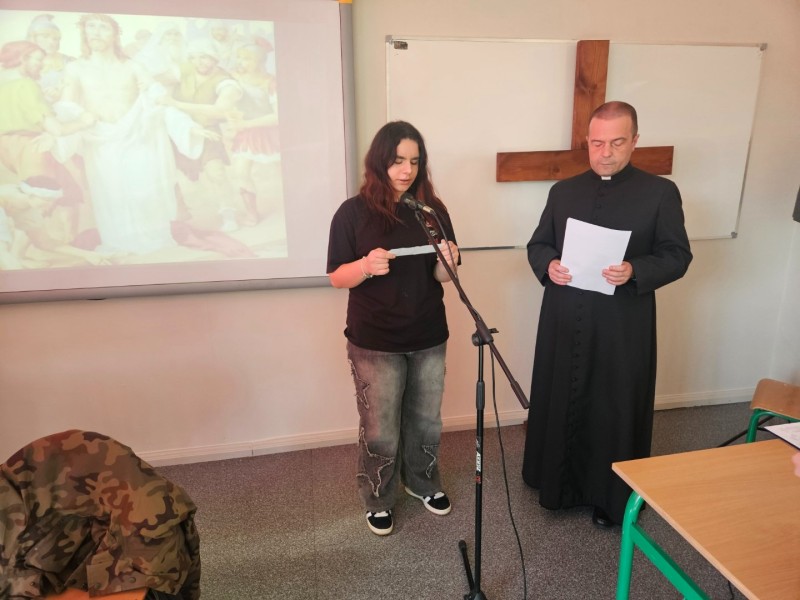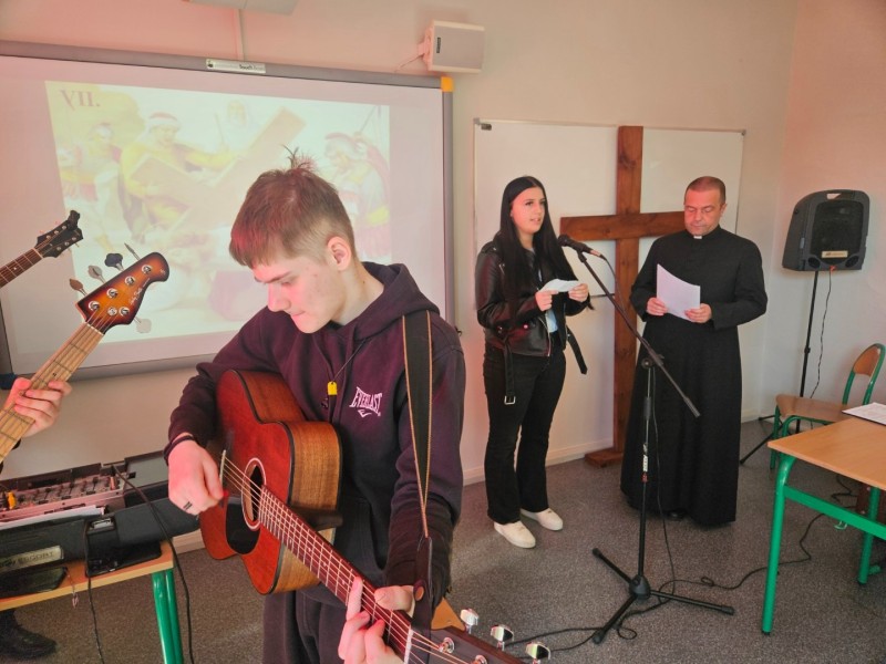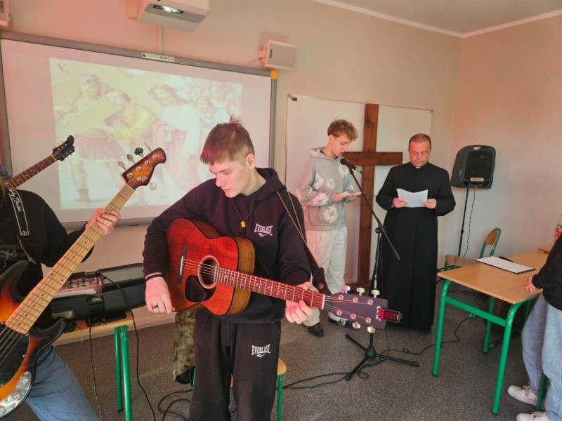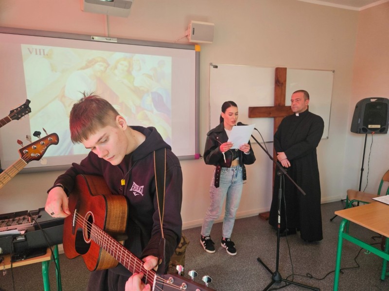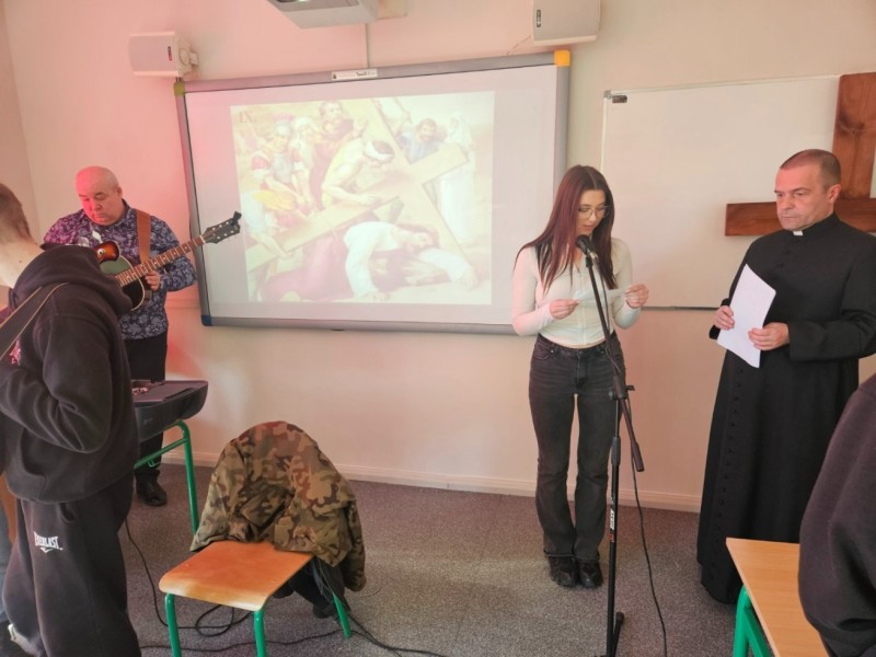 W części drugiej symbolicznie towarzyszyliśmy Panu Jezusowi w Jego drodze na Golgotę, rozważając kolejne stacje Drogi Krzyżowej. Poruszające refleksje przygotowane przez Księdza Artura Kazeckiego czytali chętni uczniowie.